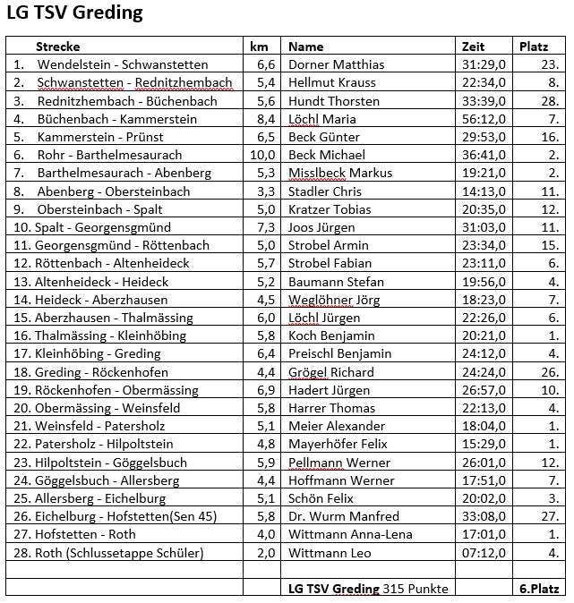 Die LG TSV Greding startete mit 28 Läuferinenn und Läufern beim Landkreislauf und erreichte einen hervorragenden 6. Platz.